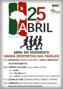 Em Avis, o dia de comemoração do 49.º Aniversário do 25 de Abril vai começar com a iniciativa “Abril em Movimento”, numa Manhã Desportiva dedicada às Famílias e repartida entre Jogos Infantis, Orientação pelos Monumentos e Corrida 25 de Abril, com partida, às 10h50, do Largo Cândido Reis.