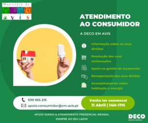 Faça o seu agendamento através do número 939 955 215 ou do e-mail apoio.consumidor@cm-avis.pt