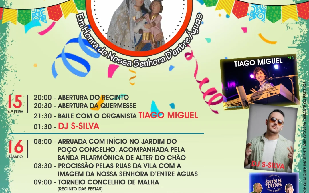 O evento contará com um programa diversificado, que vai da abertura do recinto e da quermesse à arruada, acompanhada pela Banda Filarmónica de Alter do Chão, e à Procissão pelas ruas da Vila com a imagem de Nossa Senhora D’Entre Águas, à Malha, ao Futsal e ao Power Junp.