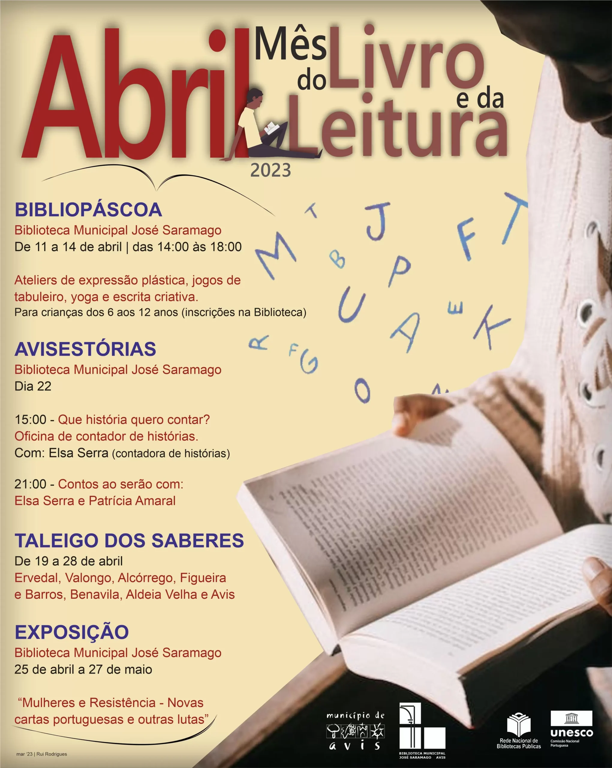 Neste contexto, são muitas as atividades que envolvem livros, leituras e leitores, nomeadamente a “Bibliopáscoa”, que inclui ateliers de expressão plástica, jogos de tabuleiro, Yoga e escrita criativa, o Avisestórias, que traz consigo uma “Oficina de Contador de Histórias” e também uma noite de “Contos ao Serão”, o “Taleigo dos Saberes”, um atelier de atividades educativas e de animação e promoção do livro e da leitura dirigido ao público Sénior, e ainda a Exposição “Mulheres e Resistência – Novas Cartas Portuguesas e outras lutas”, elaborada a partir da obra das “Três Marias”.