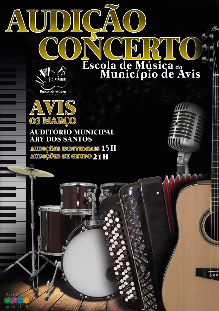 A Escola de Música do Município de Avis apresenta, no dia 3 de março de 2024, no Auditório Municipal Ary dos Santos, a sua Audição Concerto.