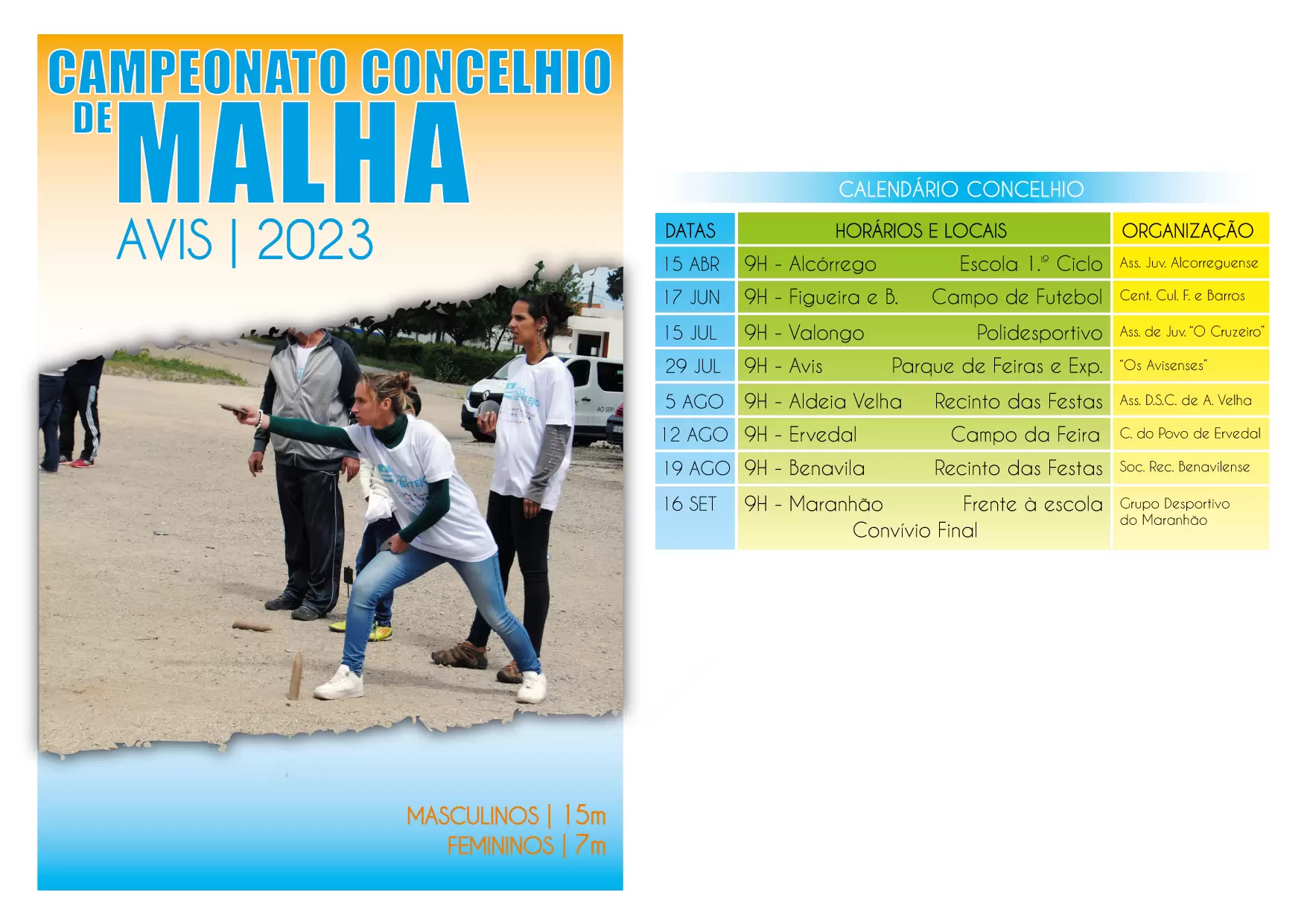 Fique a par do Calendário do Campeonato Concelhio do Jogo da Malha. Participe nesta ronda de Jogos que, de abril a setembro, irá percorrer as Freguesias/Uniões de Freguesias do Concelho, com vista ao apuramento da classificação final de cada um dos 8 Torneios incluídos nesta Jornada.