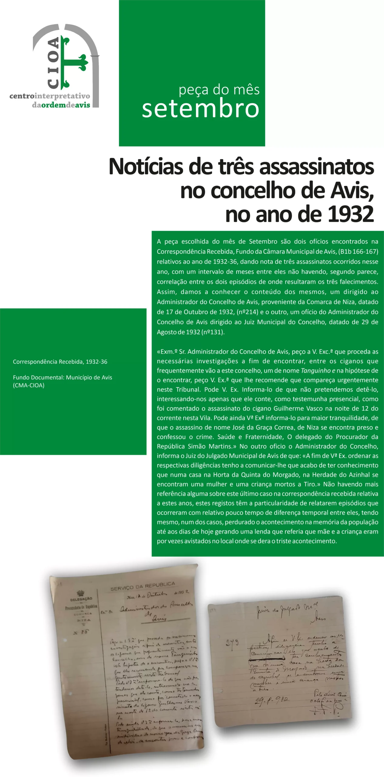 Em setembro, o Centro Interpretativo da Ordem de Avis (CIOA) destaca, em “Peça do Mês”, as notícias de três assassinatos no concelho de Avis, no ano de 1932.
