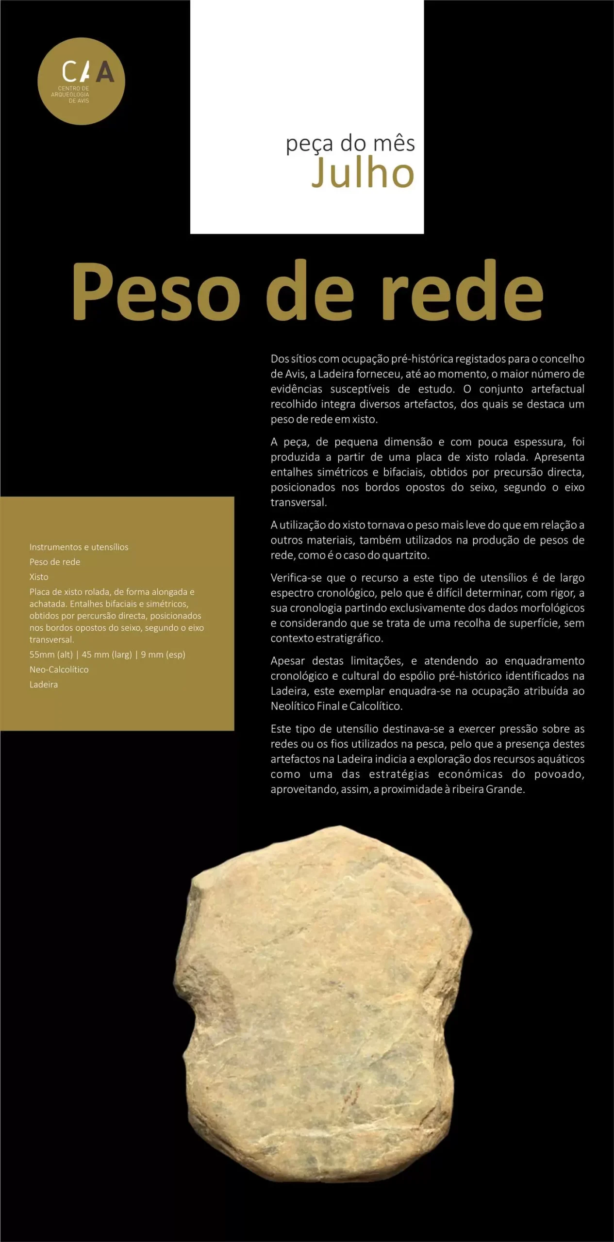 Até ao final do mês de julho, passe pelo Posto de Turismo de Avis e conheça, de perto, mais um objeto do acervo do Centro de Arqueologia de Avis (CAA) em destaque na “Peça do Mês” – o Peso de Rede.