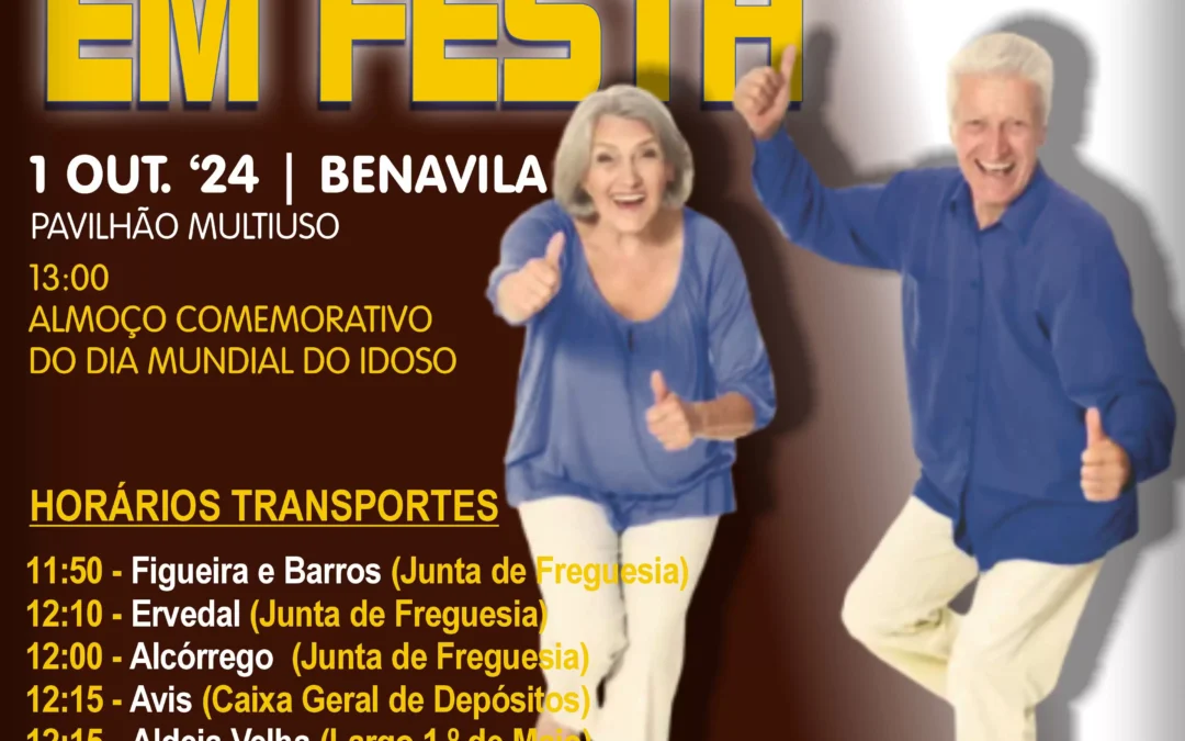O Município de Avis vai assegurar o transporte de todos os reformados, pensionistas e idosos do Concelho de Avis que se inscreveram para o Almoço Comemorativo do Dia Mundial do Idoso, que se realiza no próximo dia 1 de outubro, às 13h00, no Pavilhão Multiusos, em Benavila.