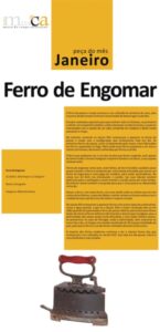 Em janeiro, a escolha da “Peça do Mês”, do MusCA, recai sobre o Ferro de Engomar, uma alfaia doméstica, em ferro que servia para passar a roupa, alisando-a através do seu aquecimento, obtido pelas brasas incandescentes que se colocavam no interior do mesmo.