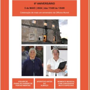 A Officina Mundi, o espaço que acolhe o atelier da artista plástica Joana Villaverde, em Avis, celebra o seu 6.º Aniversário no próximo dia 5 de maio. A programação, a decorrer entre as 11h00 e as 13h00, inclui a participação especial das convidadas Senhorinha e Otília.
