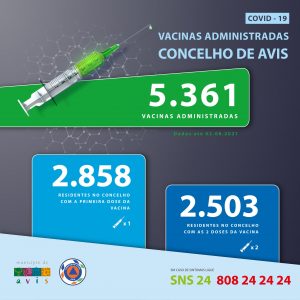 Segundo os dados das Autoridades de Saúde, até dia 2 de agosto, foram administradas no Concelho de Avis um total de 5.361 doses de vacinas contra a COVID-19, sendo que 2.858 residentes já receberam uma dose da vacina e 2.503 já receberam 2 doses ou vacina de dose única.