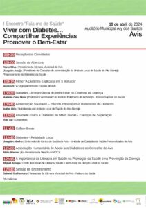 Neste Encontro, constituído de participações diversas – com a “A Diabetes Explicada em 5 Minutos” em destaque no Filme apresentado pelos Alunos do 9.º A, do Agrupamento de Escolas de Avis – António Casa Nova, Professor Coordenador do Instituto Politécnico de Portalegre – Escola Superior de Saúde, Isabel Lírio, Nutricionista da Unidade Local de Saúde do Alto Alentejo, Ana Vaz, Desportista, Joaquim Abelho, Enfermeiro do Centro de Saúde de Avis – Unidade de Cuidados de Saúde Personalizados de Avis, Nídia Máximo, Ex-Presidente da Direção da AHADCA, e Miguel Arriaga, Chefe da Divisão de Literacia, Saúde e Bem-Estar da Direção-Geral da Saúde, serão os oradores convidados.